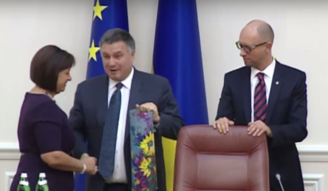 Министр внутренних дел Украины Арсен Аваков по случаю достижения Украиной договоренностей о реструктуризации 20% госдолга подарил министру финансов Украины Наталье Яресько декоративно расписанную гильзу от 120-мм снаряда.