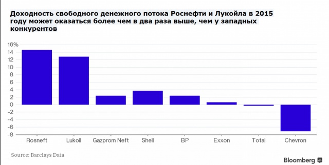 Благодаря налоговой системе и девальвации рубля доходность свободного денежного потока «Роснефти» и «ЛУКойла» в 2015 г. может оказаться более чем в два раза выше, чем у BP и Shell, следует из данных Barclays Plc.
