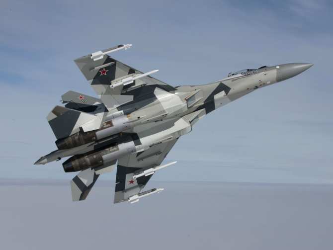 Су-35 – новейший многоцелевой сверхманевренный истребитель поколения 4++. Он способен развивать скорость до 2,5 тыс. км/ч, дальность полета достигает 3,4 тыс. км, боевой радиус – около 1,6 тыс. км. В вооружение входит 12 точек подвески для бомб и ракет, пушка калибра 30 мм. Также истребители оснащены комплектами бортовой электроники, включающими новые комплексы радиоэлектронной борьбы, фазированной антенной решеткой и двигателями с управляемым вектором тяги.