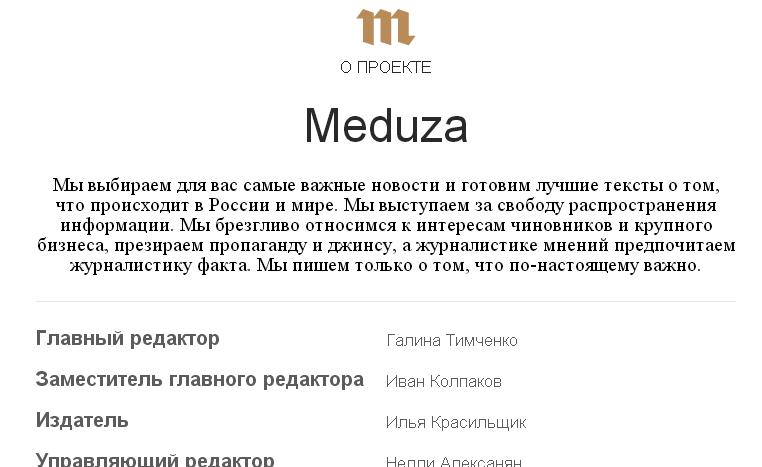 «Meduza» history is remarkable by itself. The project started in October 2014, its author is Galina Tymchenko who was editor in chief of one of the biggest and most succesful Russian news recsource «Lenta.ru» since 2004 to 2014. She was dismissed in March 2014 soon after she hyperlinked one of her articles with Ukrainian nationalist Dmytro Yarosh's interview .
