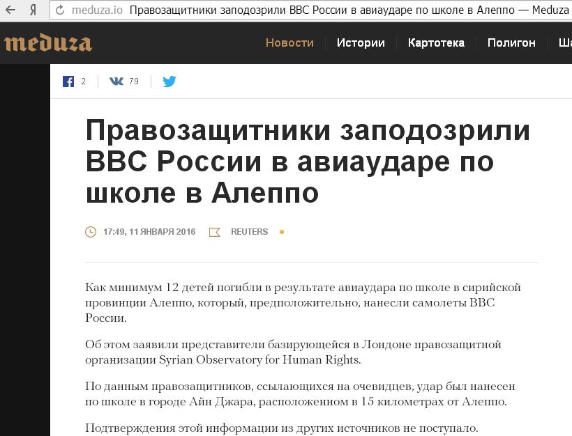 January 11 «Meduza» project web site belonging to Latvia-registered web edition «Meduza Project SIA», published a translation of «Reuters» news with the headline «Human Rights Activists suspect Russian Air Force of an airstrike on Aleppo school».