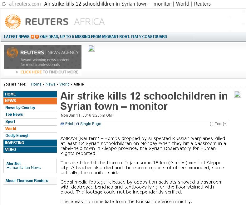 Reuters news authors blaim Russian Air Force for death of «at least 12 children» who allegedly died due to Aleppo bombing by Russian Air Force.