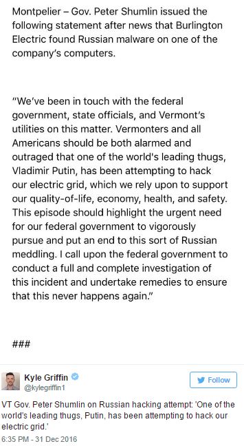 That tweet from Griffin — convincing people that Putin was endangering the health and safety of Vermonters — was re-tweeted more than 1,000 times. His other similar tweets — such as this one featuring Vermont Sen. Patrick Leahy’s warning that Putin was trying to “shut down [the grid] in the middle of winter” — were also widely spread.