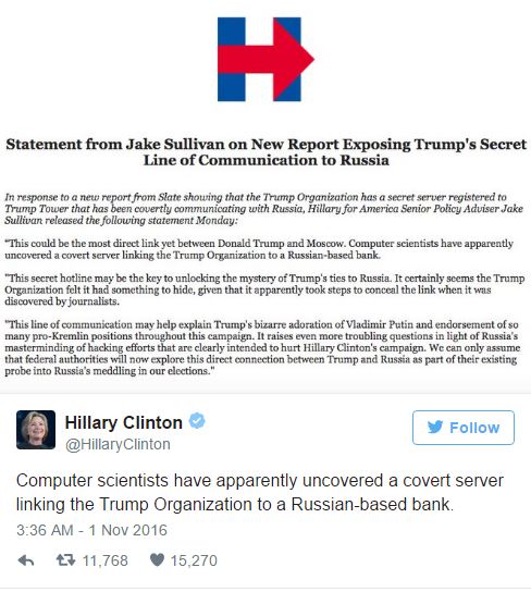 It is no coincidence that many of the most embarrassing journalistic debacles of this year involve the Russia Threat, and they all involve this same dynamic. Perhaps the worst one was the facially ridiculous, pre-election Slate story — which multiple outlets (including The Intercept) had been offered but passed on — alleging that Trump had created a secret server to communicate with a Russian bank; that story was so widely shared that even the Clinton campaign ended up hyping it — a tweet that, by itself, was re-tweeted almost 12,000 times.