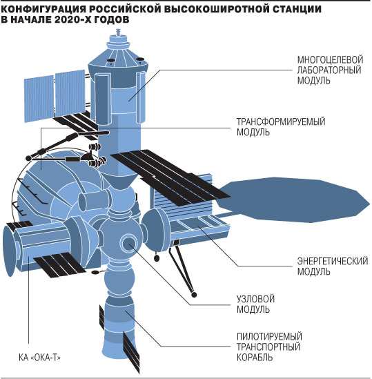 Как сообщил российскому изданию «Коммерсант» источник, близкий к руководству Центрального научно-исследовательского института машиностроения (головное научное предприятие отрасли), вывод на орбиту российской высокоширотной орбитальной станции является одним из ключевых предложений проекта развития пилотируемой космонавтики на период до 2050 года. Этот документ готовит совместная группа Роскосмоса и причастных научных организаций. Российскую станцию предлагается развернуть в период с 2017 по 2019 год. «Первоначальная конфигурация будет формироваться на базе многоцелевого лабораторного и узлового модулей, космического аппарата „ОКА-Т“,- говорит собеседник издания, ссылаясь на предложения группы.- Эксплуатацию станции обеспечат корабли „Союз-МС“ и „Прогресс-МС“, а в период 2020–2024 годов возможна отработка энергетического и трансформируемого модулей, используемых в лунной программе».