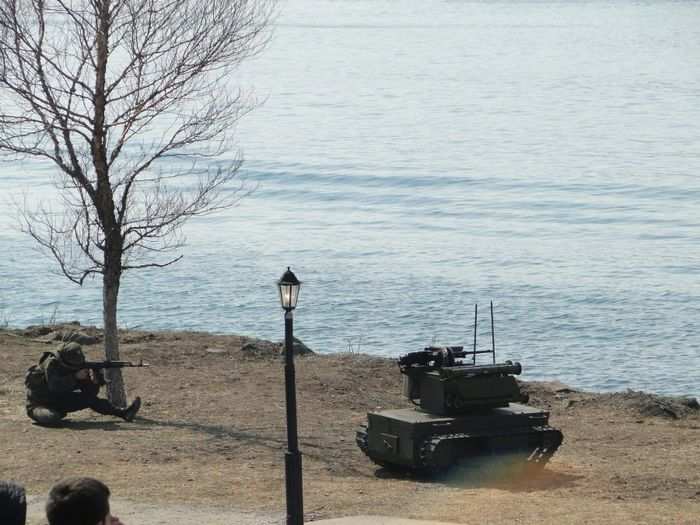 «По сценарию учений, боевой робот был задействован при уничтожении диверсионной группы, замеченной вблизи базирования подводных лодок. Он оказывал огневую поддержку подразделениям ведущим бой с условным противником, приближающимся к пирсовой зоне военно-морской базы», — сказано в сообщении пресс-службы Восточного военного округа.