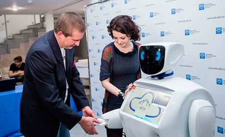 «Белоснежные накаченные бицепсы, мощный торс с широкоугольным сенсорным экраном, огромные лучистые глаза и джентльменская бабочка… Главная задача робота — собрать огромное количество научно-исследовательских данных. Евгений Плужник (первый проректор МТИ) поздравил нового сотрудника с началом работы и торжественно пожал ему руку», — говорится в сообщении, размещенном на сайте вуза.