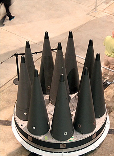 На фото: Ступень разведения ракеты МХ Peacekeeper, насчитывающая десять боевых блоков. Ракета снята с вооружения. Баллистические ракеты с разделяющейся ГЧ у американцев установлены только на подводных лодках.