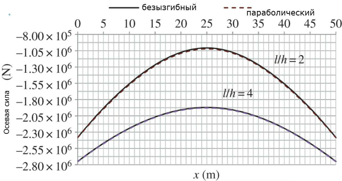 На фото: Изменение осевой силы по всей длине арки для двух типов арок – высокого и среднего подъёма.