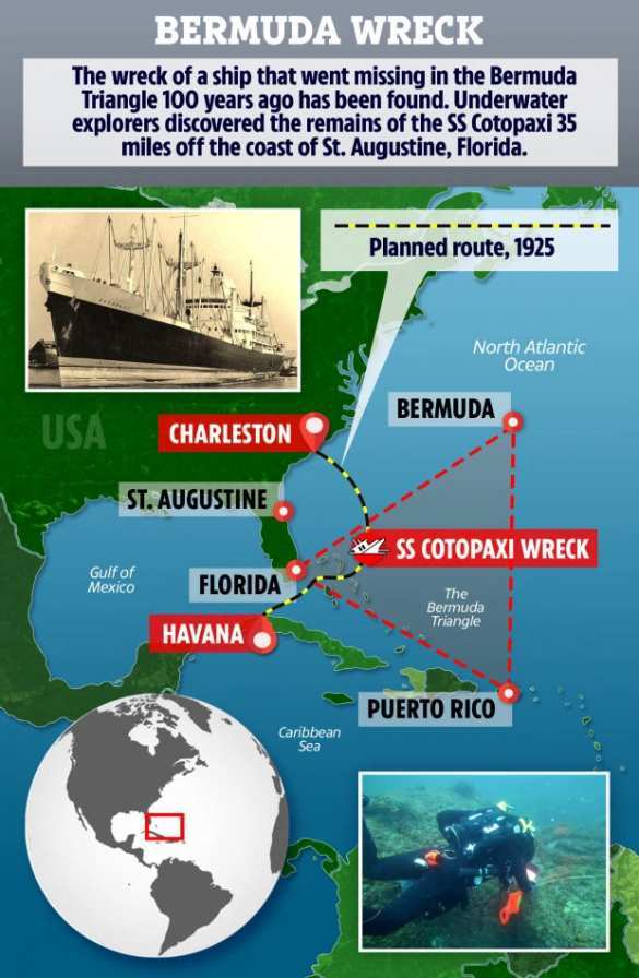 Американский пароход SS Cotopaxi, перевозивший уголь, вышел из порта Южной Каролины 29 ноября 1925 года. Однако до пункта назначения — порта Гаваны на Кубе — ни корабль, ни один из 32 членов экипажа не добрался.