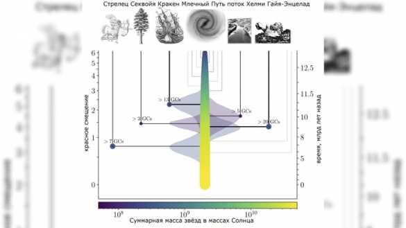 История поглощения галактик Млечным Путём по данным нового исследования. На иллюстрации приведено количество шаровых скоплений (globular clusters, GCs), доставшихся Галактике в каждом таком событии.