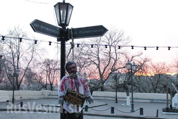 In Odessa eine gekleidete in blutigem ukrainischen Hemd Puppe von Poroschenko gehängt wurde (VIDEO)