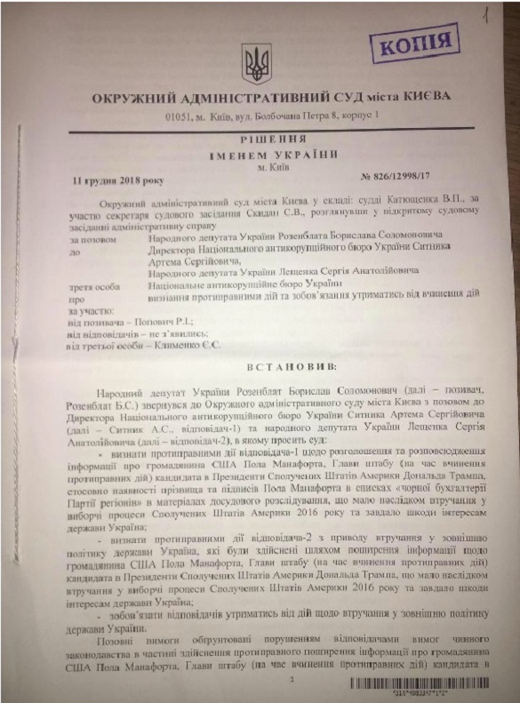 А вот депутат Борислав Розенблат не стал связываться с ангажированными правоохранительными органами и сразу подал в суд аналогичный иск. В декабре 2018 года Окружной административный суд Киева признал виновными главу НАБУ Артема Сытника и нардепа Сергея Лещенко в незаконном разглашении материалов следствия и вмешательстве в американские выборы.