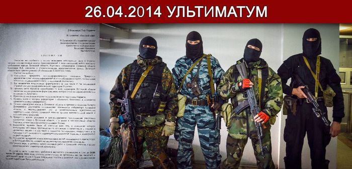 — Если до 14 часов вторника 29 апреля, все наши требования, подкрепленные Женевскими соглашениями, не будут выполнены, мы считаем все органы власти, которые находятся в Киеве, антинародными и преступными, и переходим к активным действиям.