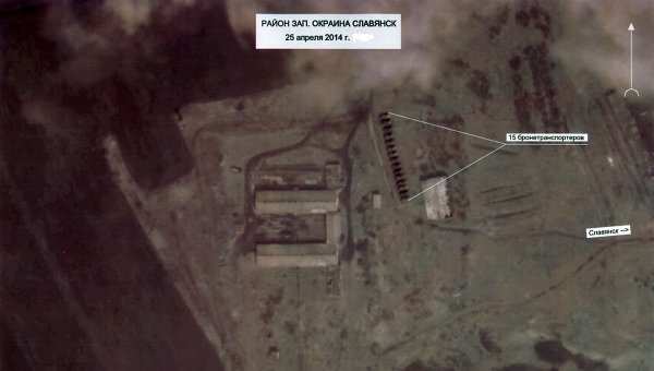 На фотоснимках со спутников отчетливо различимо скопление большого количества украинской военной техники и вооружения на границе с РФ и в окрестностях Славянска на севере Донецкой области, где продолжается противостояние сторонников федерализации и подконтрольных Киеву силовиков.