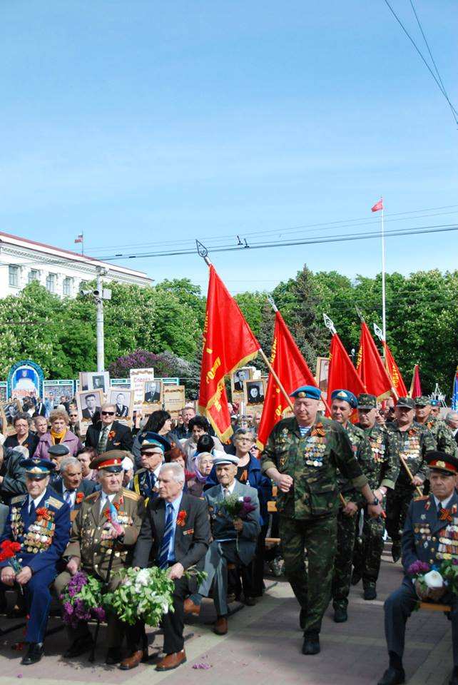 Вопреки разным провокационным вбросам, 9 мая в Луганске прошло на высоком уровне. К 9.00 на центральной площади у Пилона Славы собралось более 2 тыс.ч. Толпа, постепенно разрастаясь до 6 тыс, залила всю площадь. С другой стороны улицы жиденькой цепью выстроились менты, забавно выглядевшие на фоне многочисленных щитов с красно-сине-голубым флагом «Луганской Республики».