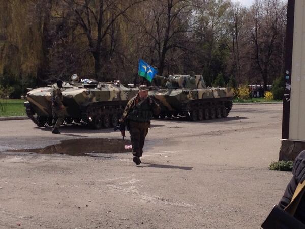 Украинские военные и боевики нацгвардии днем начали обстреливать из минометов блокпост ополчения, на поддержку из города выдвинулся отряд бронетехники и снайперов.