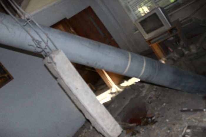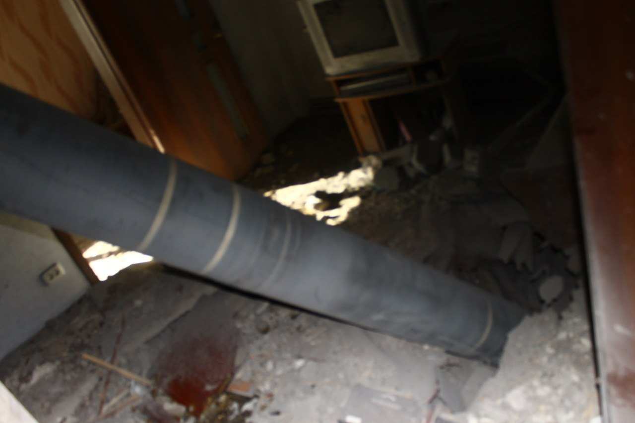 В 17.00 группа пресс-центра выехала в район г. Лисичанска. В домах по адресам ул. Ленина д. 173 и ул. Свердлова д. 300 нашей группой обнаружена несколько ракет (более трех штук) системы залпового огня «СМЕРЧ», которыми украинская армия обстреливает жилые районы Лисичанска. Длина ракеты около 3 метра диаметр 0,5 метра. Одна из ракет «Смерч» пробила крышу трехэтажного дома и бетонные перекрытия и остановилась на первом этаже в 70 градусов. (см. фото и видео ниже).