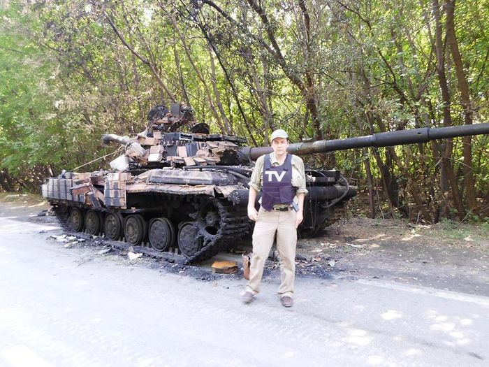 Мы вместе с оператором Олегом выдвинулись на такси в район минувшего боя, пошли по левой стороне автотрассы Красноармейская, слева и справа была зеленка — деревья и кусты, которых могли залечь снайпера. Наконец, пройдя 150 метров, увидели слева на обочине, стоящий подбитый черно-зеленый танк. Подошли вплотную. Возле подбитого танка лежали три трупа в форме укр. военных — нациков. Рядом валялся танкистский шлем. Не было ни души. По трупам ползали мухи. Около траков гусениц валялась солдатская фляга. В основании башни — черная большая вмятина — след от снаряда или гранаты, выпущенной из гранатомета. Нацистский танк был блокирован на дороге и окружен с двух сторон.