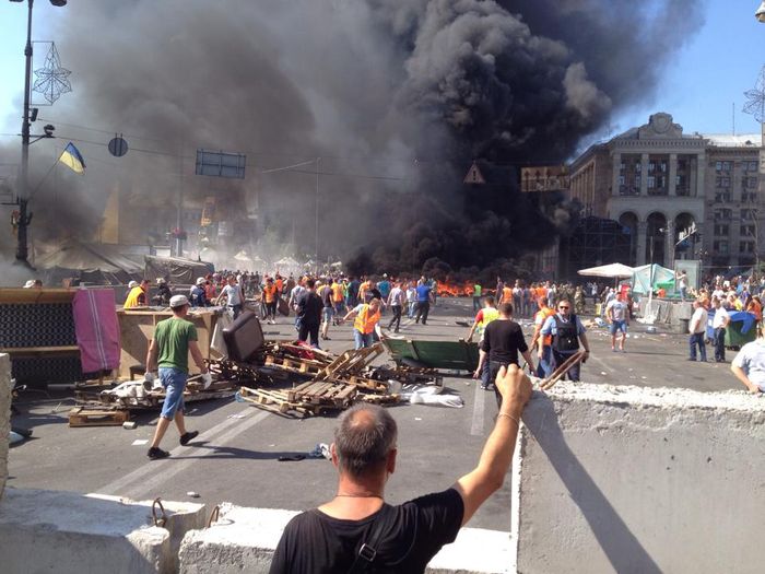 Обитатели палаточного городка на Майдане Независимости в центре Киева противостоят бойцам батальона «Киев-1», прибывшими в центр города. , Активисты бросают в сторону бойцов брусчатку, коктейли Молотова. Горят баррикады напротив Дома профсоюзов и покрышки со стороны площади Европейской. Работают пожарные расчеты. В настоящее время «майдановцы» подносят покрышки с баррикад, которые стоят на улице Институтской и пытаются их поджечь.