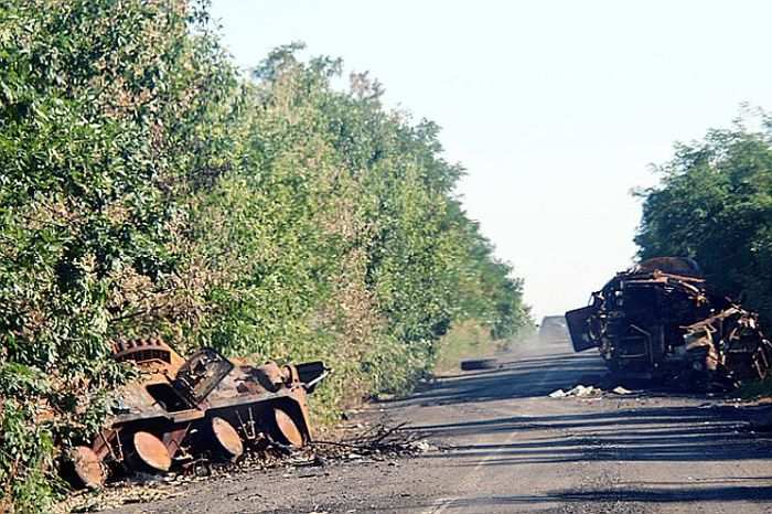 Расплавленные грузовики, раскисшие танки и всякая прочая мелкая бронетехника, разделанная на фрагменты. Такое мы уже видели в 2011 году, на трассе Бенгази-Адждабия в Ливии. Только там десятки километров бронетехники были расстреляны, как в тире, с воздуха. А здесь рубились лоб в лоб, неся огромные потери с обеих сторон. Рубились, чтобы пробить дорогу жизни в Россию после того, как все пути через Луганскую область были отрезаны украинскими военными.