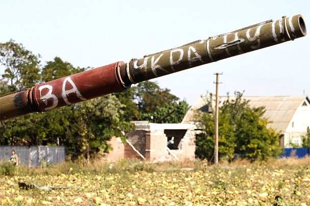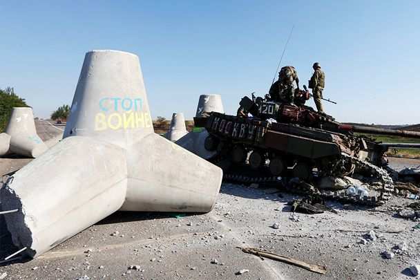 Танк украинских военных 5 сентября на въезде в Мариуполь врезался в противотанковый ёж, украшенный изображениями голубей и призывами к миру.