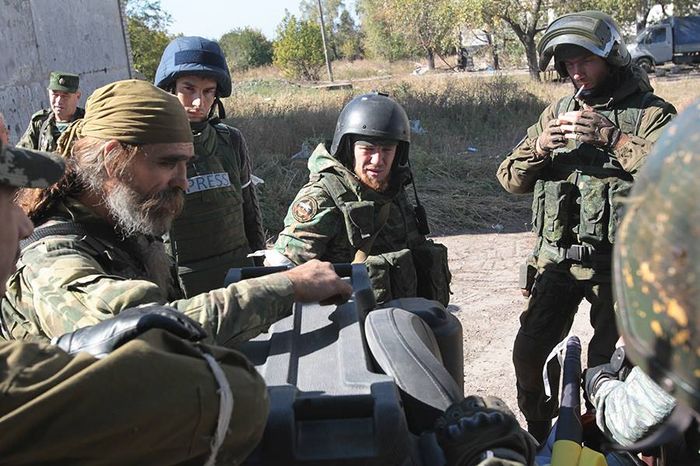 Другой отряд «Сомали». Они берут аэропорт. Возглавляет Гиви, грузин из Иловайска. Видите, он хохочет рядом с Моторолой? «Сомали» — он так иронично обозвал отряд. «Сомалийцами» — на местном сленге называют необученных и необстрелянных, которых полным полно.