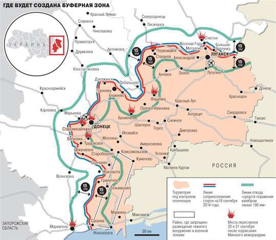 Между тем постпред России при ОБСЕ Андрей Келин накануне рассказал, что по его данным «примерно на 70 процентов зоны безопасности, или буферной зоны, а это 320 километров от восточной части российской границы до Новоазовска, есть несколько участков, где продолжаются боевые действия». Среди наиболее горячих точек он назвал донецкий аэропорт, луганский пригород Счастье, где находится снабжающая Луганск ТЭЦ, Дебальцевский железнодорожный узел и районы близ Мариуполя.