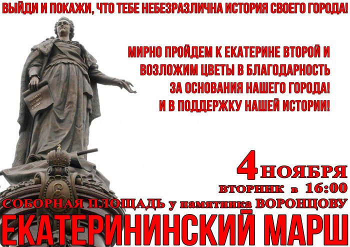 4 ноября в Одессе в прежние годы проходили как «русские марши», так и мероприятия, посвященные дню Национального единства, который отмечается в России. Накануне этой даты в этом году по городу были расклеены листовки, призывающие всех одесситов пройти к памятнику основательницы города Екатерине II.