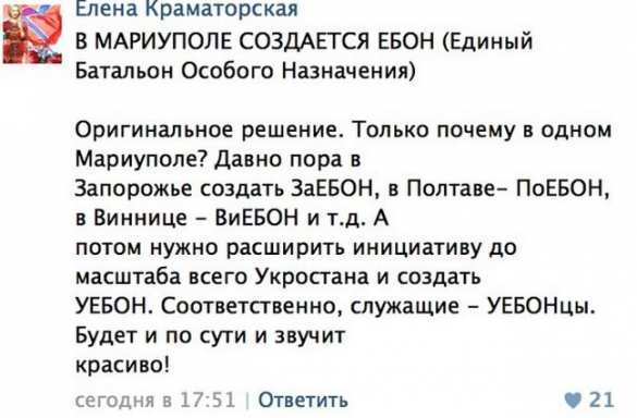 Бывшие украинцы живо отреагировали на гениальную аббревиатуру и уже предложили Аброськину создать нечто подобное в Виннице и назвать — ВиЕБМОН, в Запорожье — ЗаЕБМОН, в Полтаве — ПоЕБМОН, в Хмельницком — страшно выговорить, что получается. А в масштабах всей Украины это слово обдумайте сами, но получается очень символично и патриотично.