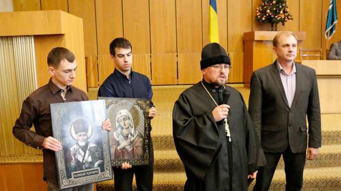 Во время совещания в Славянском городском совете Олег Зонтов торжественно передал иконы, подаренные назначенным хунтой «городом-побратимом» Коростенем, настоятелям раскольнических церквей Славянска, так называемого «Киевского Патриархата».