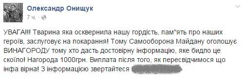 «Животное, которое осквернило нашу гордость, память о наших героях, заслуживает наказания! Поэтому Самооборона Майдана объявляет НАГРАДУ тому, кто даст достоверную информацию, что за быдло это натворило! Награда — 1000 гривен. Выплата после того, как мы убедимся, что информация верна!»
