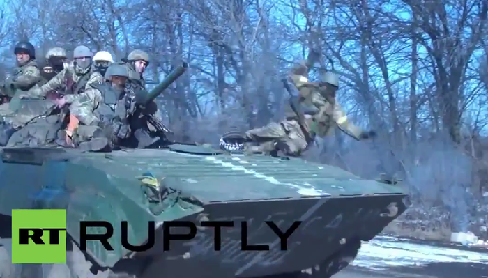 Во время отступления из Дебальцева измождённый киевский солдат свалился с брони боевой машины пехоты на полном ходу. Видео инцидента появилось в сети.