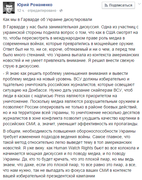 — Я знаю, как решить проблему уменьшения внимания и вывести проблему медиа на новый уровень. ВСУ должны избирательно и тщательно уничтожать российских журналистов, которые освещают ситуацию на Донбассе. Нужно дать указание снайперам ВСУ, что люди в касках с надписью Press являются приоритетом на уничтожение. Поскольку медиа являются разрушительным оружием и позволяют России оперировать не только в районе боевых действий, но и на территории всей Украины, то уничтожение несколько десятков журналистов в зоне конфликта позволит ухудшить качество картинки в российских СМИ, а значит, уменьшит эффективность их пропаганды, — написал Юрий Романенко.