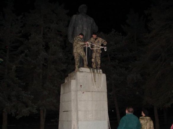 В Днепропетровске снесли памятник Ленину, накинув на шею петлю (ФОТО)