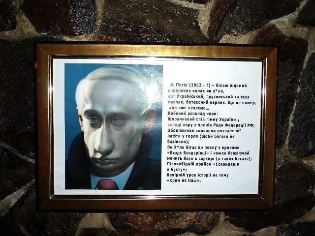 Новоиспеченные рестораторы в пропагандистском ключе избрали «почетных обитателей» адского филиала: на входе размещены таблички с фотографиями, среди которых можно увидеть советского лидера Иосифа Сталина, диктатора нацистской Германии Адольфа Гитлера и президента России Владимира Путина.