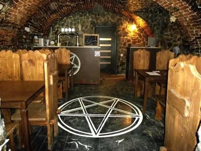 «Мы начали искать свободное помещение, и когда наткнулись на небольшой подвальчик, мы буквально сразу определились с тематикой заведения. В этом нет никакой оккультной или сатанинской идеи, это просто арт-объект, аттракцион, к созданию которого мы подходили с большой долей юмора», — оправдывается Алексей.