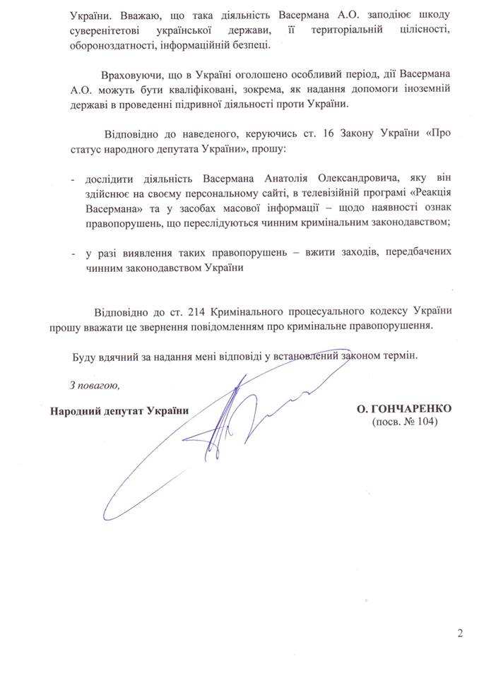 В случае подтверждения моих опасений о наличии в словах Вассермана призывов к свержению власти в нашей стране и клевете на государственный строй, требую от СБУ адекватной реакции, вплоть до заведения уголовного дела и принятия срочных мер по розыску Вассермана.