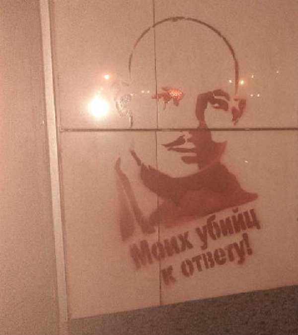 В метро Киева появились граффити с изображением портрета расстрелянного минувшей весной писателя Олеся Бузины и подписью: «Моих убийц — к ответу».
