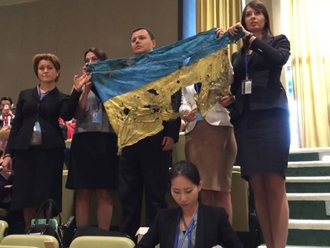 Присутствующие, однако, не оценили креатив украинских делегатов, и после того, как охранник отобрал у них флаг, им пришлось покинуть зал.