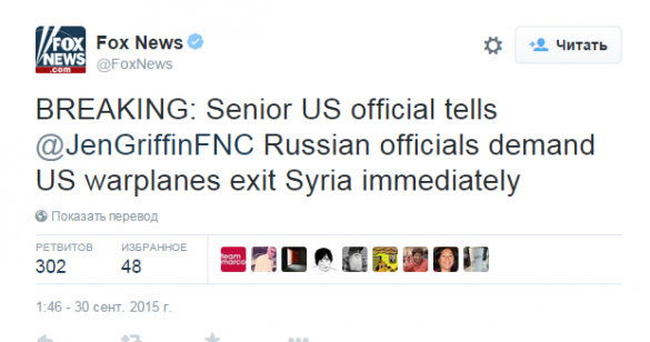 МОЛНИЯ: СМИ США сообщают, что Россия официально потребовала немедленно убрать американские самолеты из воздушного пространства Сирии