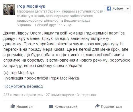 «Я принял решение снять свою кандидатуру с выборов на пост мэра Киева. Это не легкий для меня шаг, но я понимаю, что будет намного эффективнее, если все свои силы я направлю на борьбу с установлением нового режима, борьбой за правду, свободу и свободу слова в Украине», — заявил Мосийчук.