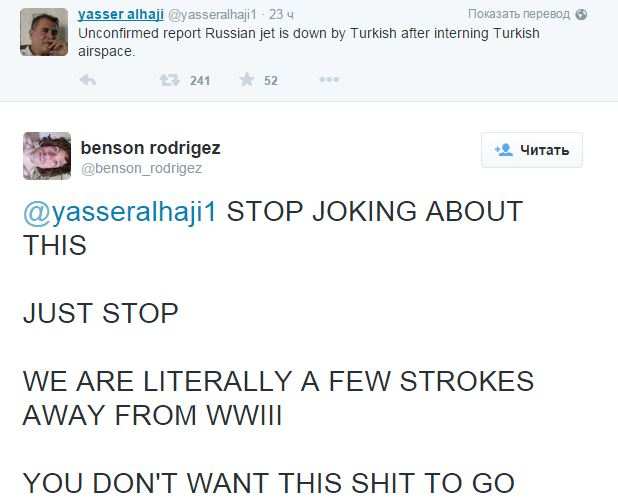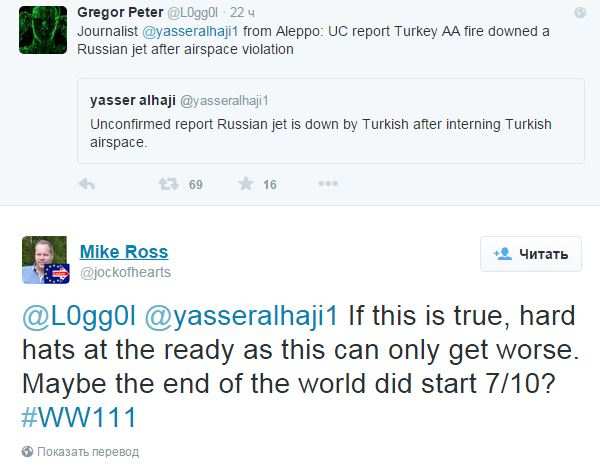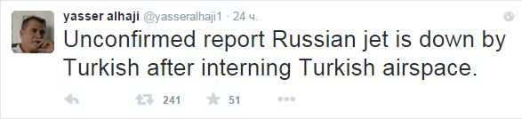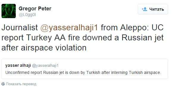 Основанием для такой ошеломительной сенсации — а сбитый турецкими ВВС российский самолёт вполне тянет если не на casus belli, то на обмен дипломатическими нотами и отзыв послов — стало сообщение в твиттере некоего yasser alhaji «Неподтверждённое сообщение: русский самолёт был сбит турками после вторжения в турецкое воздушное пространство».