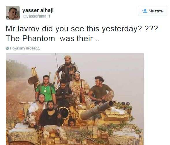 Так, например, в качестве реакции на реплику министра иностранных дел Сергея Лаврова о том, что «никто не представляет что такое "Сирийская свободная армия", которая фактически является фантомом», Yasseralhaji1 выложил фотографию каких-то бородатых людей, сидящих на танке, снабдив её комментарием: