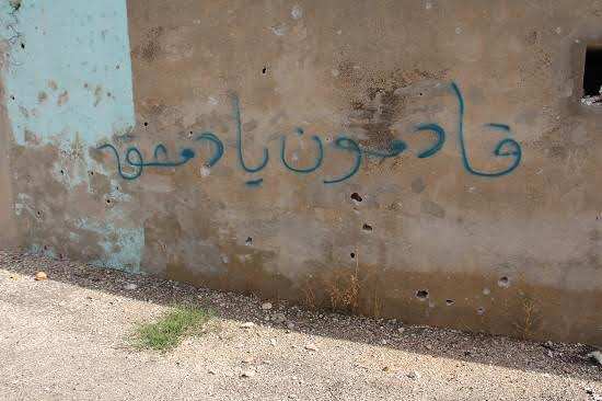 Представлена разбитая техника террористов, человеческие останки в придорожной канаве, разрушенные дома, сирийские военные, коробка и накладная продуктовых и вещевых поставок из Катара боевикам, надписи на стенах домов «Мы идем, Дамаск», «Организация «Аль-Каида»*, «Джебхат ан-Нусра»*.