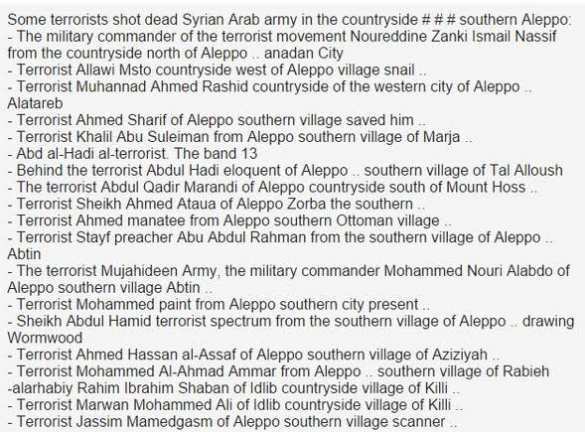 Прилагаю списки убитых вчера под Алеппо террористов — их там немало — подготовленных для публикации в англоязычных и арабоязычных СМИ.