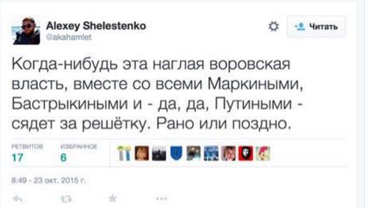 «23 октября господин Алексей Шелестенко в своем Твиттер-аккаунте сделал ряд резких политических заявлений с упоминанием официальных должностных лиц Российской Федерации, в том числе президента РФ. В связи с этим Роскомнадзор сегодня направил в адрес компании „Твиттер“ официальное письмо с просьбой уточнить, являются ли высказывания господина Шелестенко позицией компании», — сообщили в ведомстве.