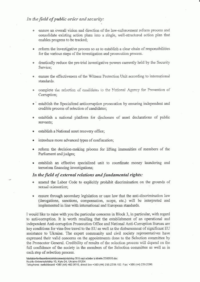Как свидетельствует документ, предоставленный МИД Украины, генпрокурор Шокин уверен, что министерство действует «не с целью выполнения Плана действий по либерализации визового режима, а на дискредитацию органов государственной власти и конкурса на занимание административных должностей в Специализированной антикоррупционной прокуратуре».