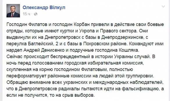 «Господин Филатов и господин Корбан привели в действие свои боевые отряды, которые имеют куртки и "Укропа" и "Правого сектора", — написал Вилкул на своей странице в Facebook. — Они выдвинули их на Днепропетровск с базы в Днепродзержинске, с переулка Баглейский, 2 и с базы в Покровском районе. Командуют ими нардеп Андрей Денисенко и подручные господина Кошляка.