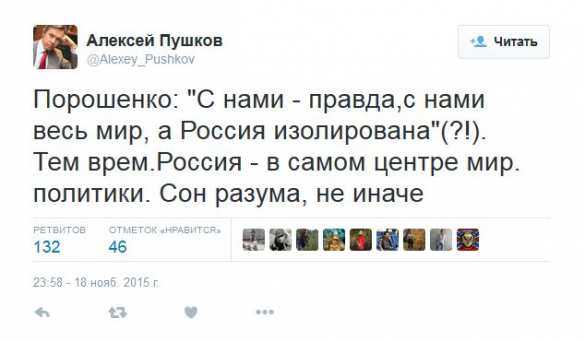Глава комитета Госдумы по международным делам Алексей Пушков на своей странице в Twitter прокомментировал слова украинского президента Порошенко о том, что Россия «находится в изоляции».